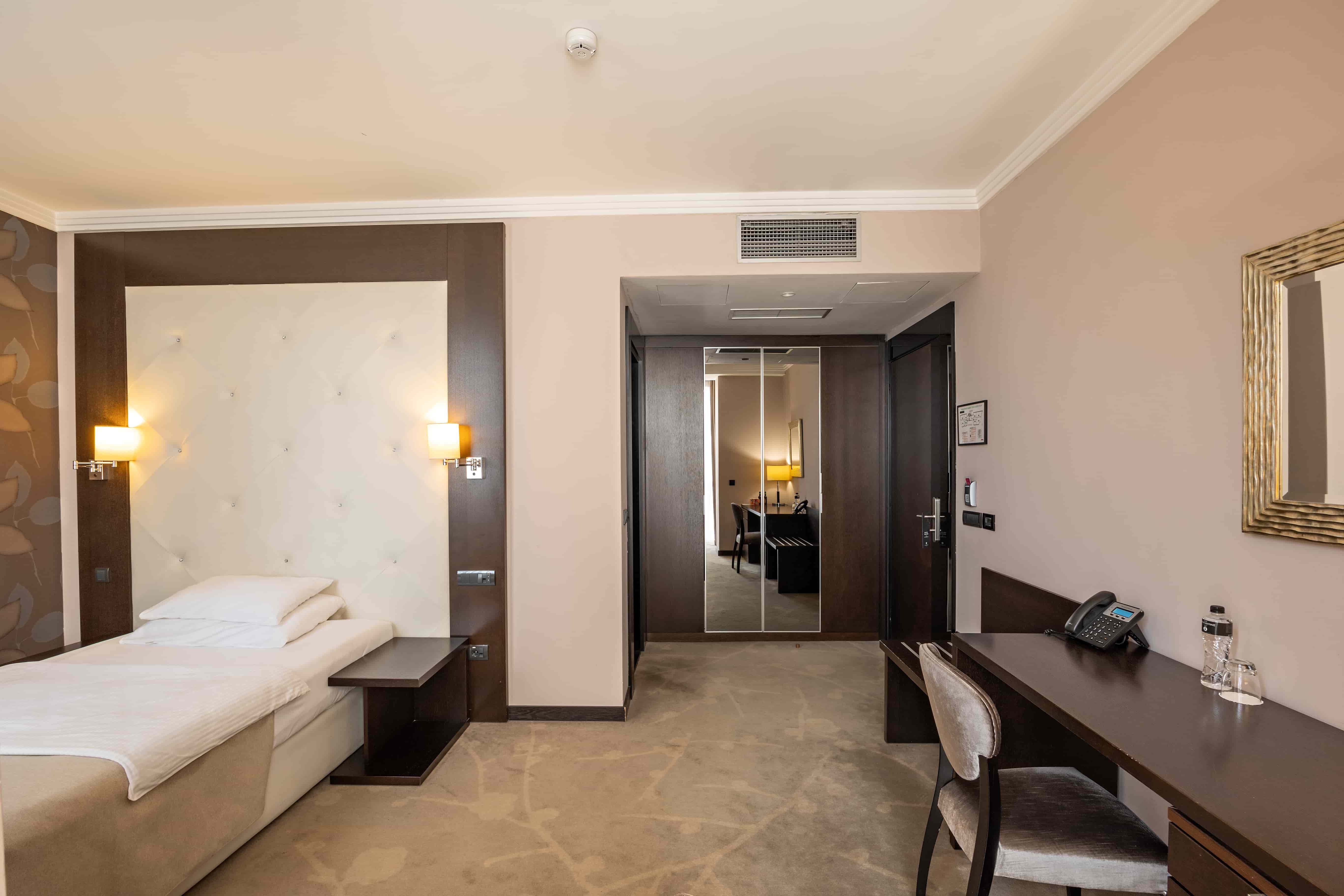 Ova jednokrevetna soba (25m2) je klimatizovana i ima prostor za sedenje, mini-bar i LCD TV sa satelitskim kanalima. Moderno kupatilo ima bade mantil, fen za kosu i bide.